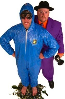 An outrageously good time awaits you at the next Fly by Night show! American comedians Stephen King and Ryan Dekoe of Boston, Massachusetts have been performing their on-the-edge brand of Dangerous Comedy since 1990. This odd and hilarious duo combine a bizarre mix of stand up comedy, juggling, sideshow antics, and "other various skills and proficiencies," into one extremely popular and unforgettable show. Their show entitled JUGGLE THIS! has a classical vaudevillian style, coupled with the sarcastic temperament of modern stand up comedians. Snappy comedic dialog, quick-witted improvisation, audience participation, amazing technical skill not to mention excitement and danger, sets the pulse of the show. Fly by Night's high-energy performances and quirky sense of humor have been witnessed internationally by hundreds of thousands of people. Steve and Ryan of Fly by Night have a certain synergy that is hard to find in a comedic duo. Their professionalism and polish as artists, is a result of countless hours of training, performing, hard work, and a passion for entertaining. |